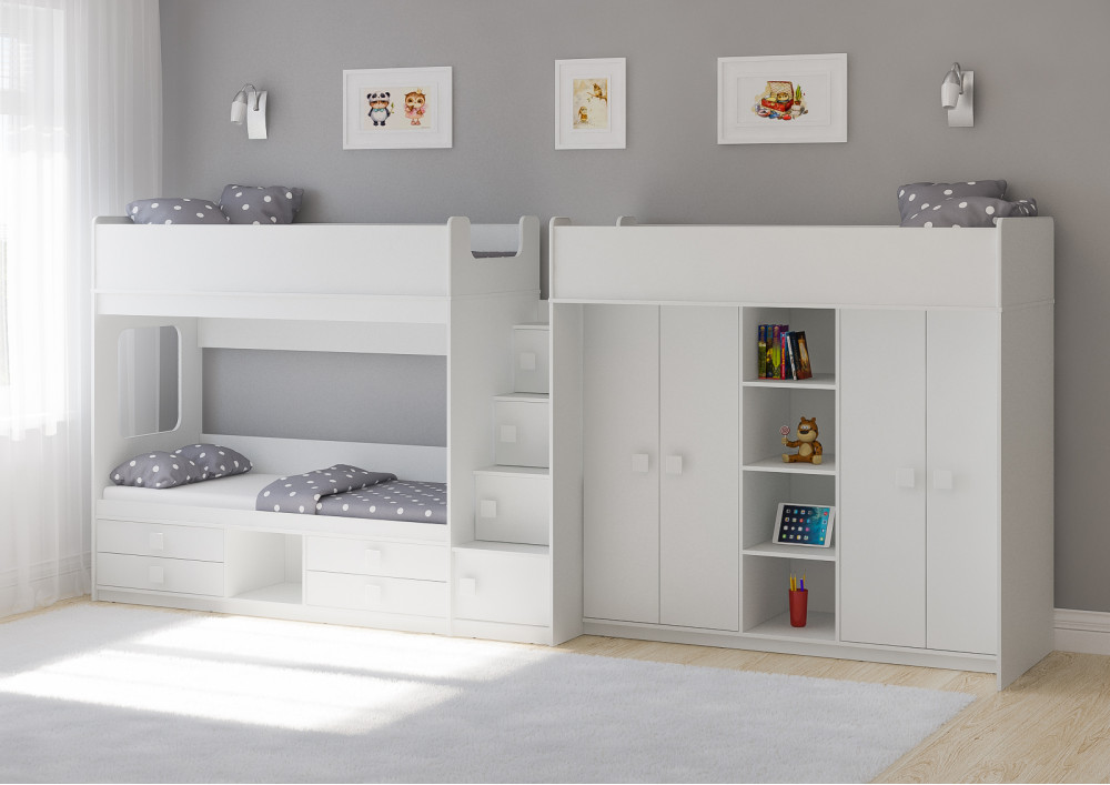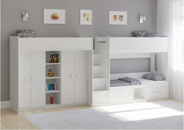 Две кровати, два шкафа, 4 выдвижных ящика – одна лестница.